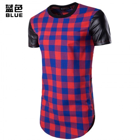 Hollow Hip-Hop High Street Men's Long Plaid Sleeves and Leather Double-Sided Zipper Arc Short-Sleeved T-Shirt