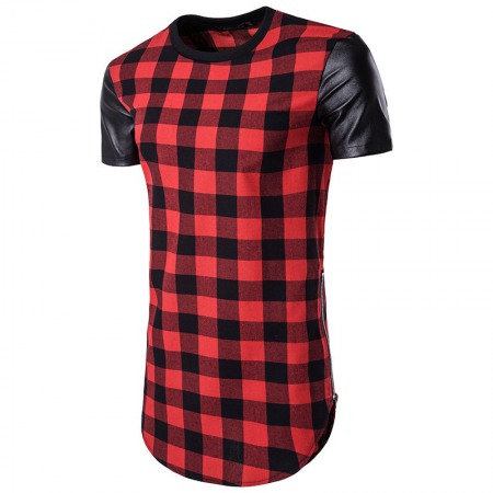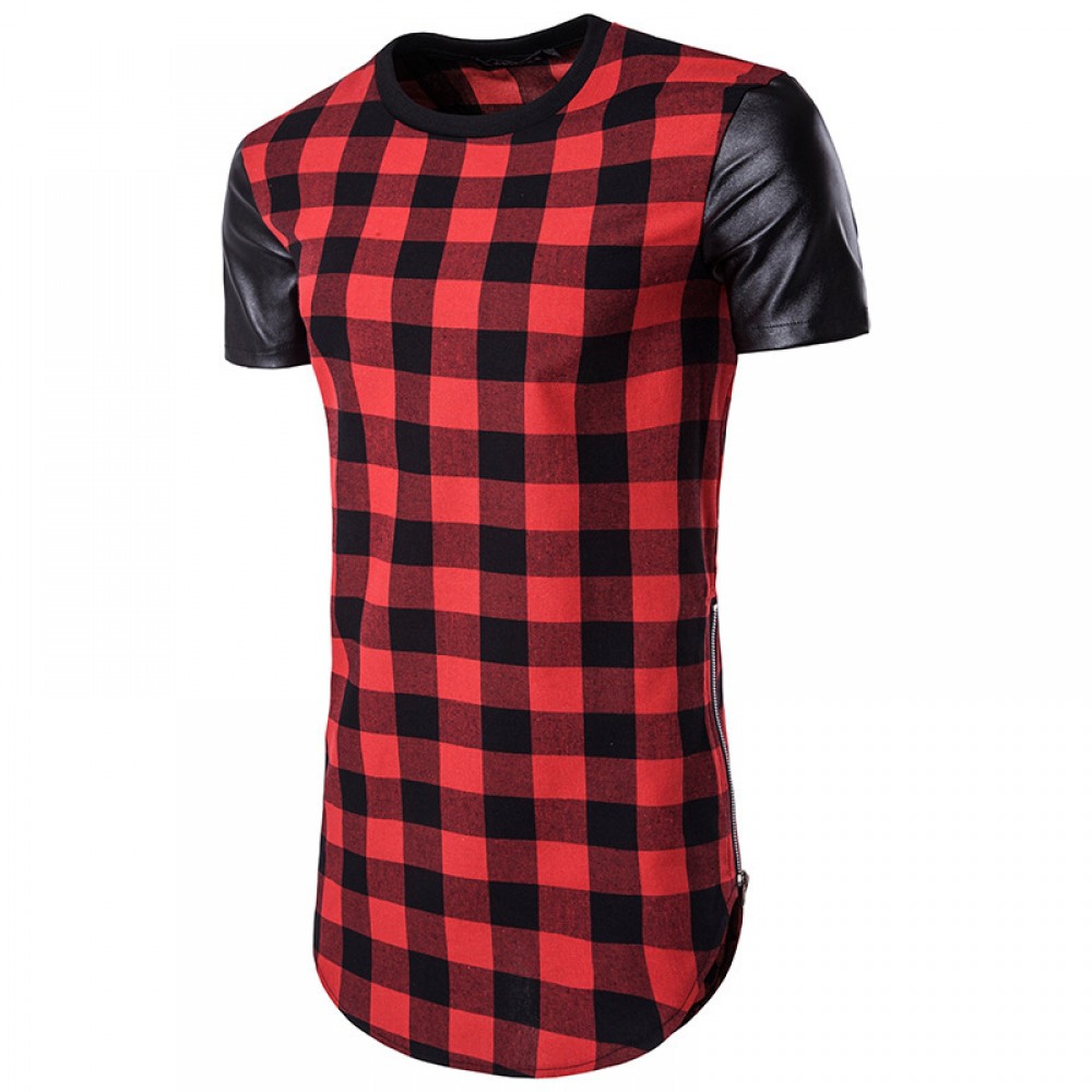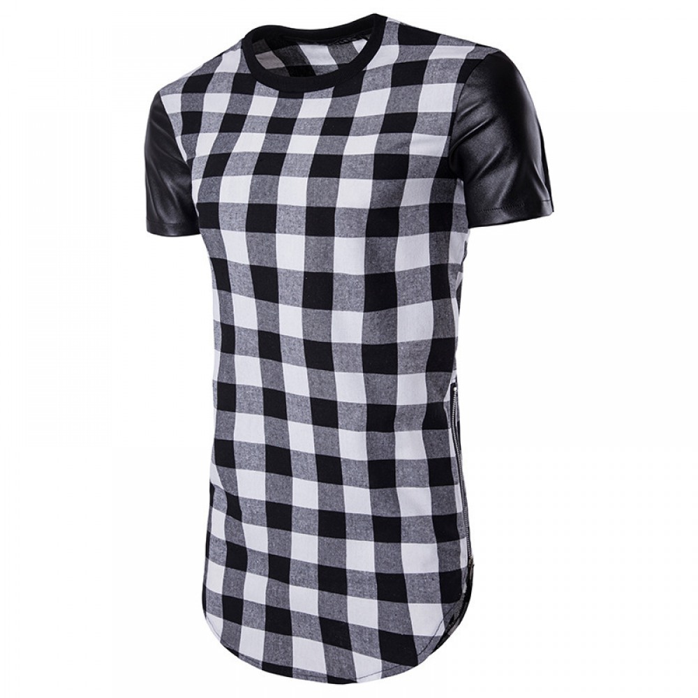 Hollow Hip-Hop High Street Men's Long Plaid Sleeves and Leather Double-Sided Zipper Arc Short-Sleeved T-Shirt